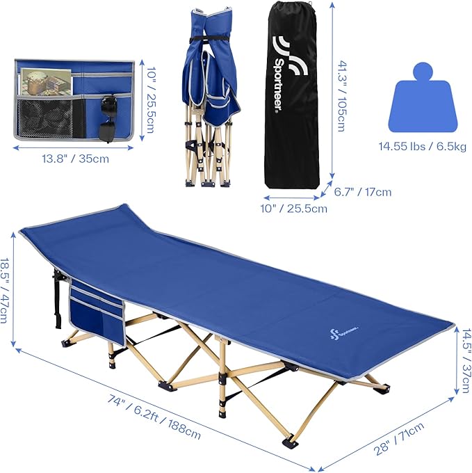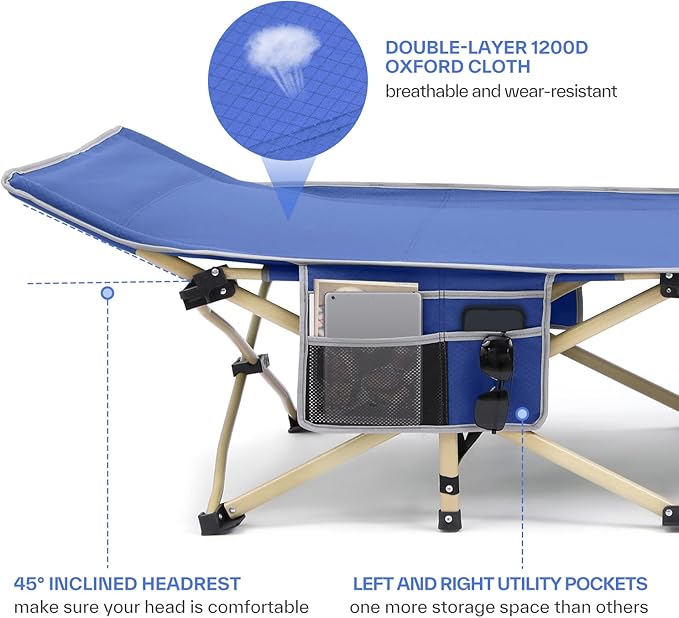 Sportneer Camping Cot: 1200D Double Layer Oxford Foldable Camping Cots for Adults - Heavy Duty Cots for Camping Travel Tent Day Outdoor & Home Guest, Camping Cots with Carry Bag & 2 Side Pockets
