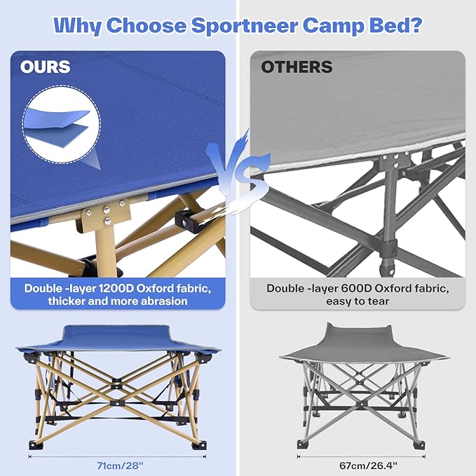 - Great Bearing Capacity & Durability: Bring it on camping trip, after camping trip, or wherever you take adventures — the Sportneer portable camping cot can handle it all. With a 1200D double-layer construction from oxford cloth, it’s water and dirt resistant. Plus, the 25mm thickened oblate square tubes have a strong bearing capacity for extreme durability.
