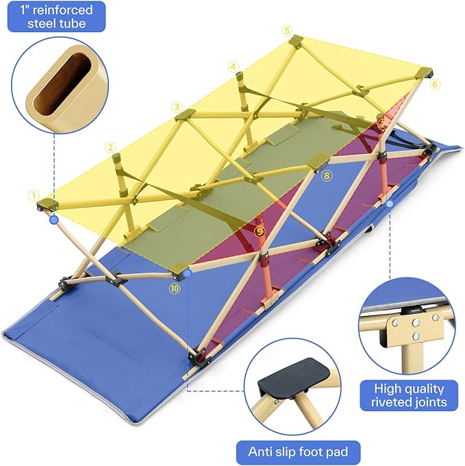 - Slim But Comfy: Just because it’s foldable doesn’t mean it can’t be comfortable! The Sportneer camping cots for adults, features a slightly tilted end made with polyester fiber so it’s comfy for sleeping even without a pillow.