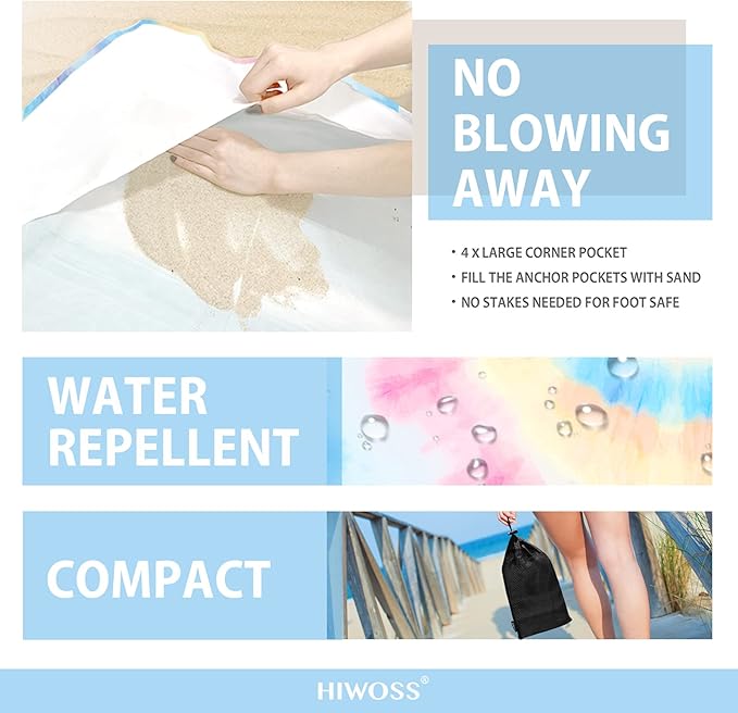 - 【UNIQUE DESIGN, 4 CORNER POCKETS】The eye-catching designed beach blanket, with quality in appearance, will make you stand out on the beach! You can easily find your family and friends on the beach without worrying about getting lost. At the same time, the beach mat is designed with four built-in corner pockets that prevent the blanket from blowing away.