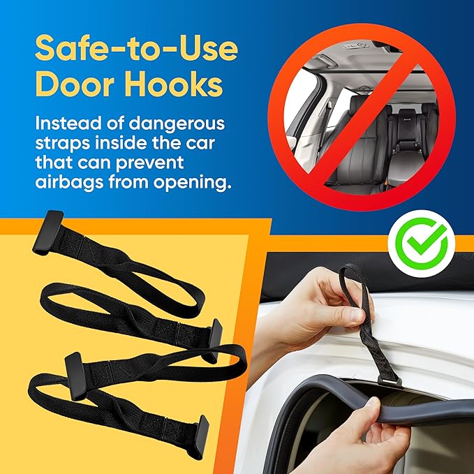 - SAFE AND EASY TO USE FOR ANY VEHICLE. Designed with your safety in mind, this car top carrier without a roof rack includes heavy-duty straps and secure door hooks that won’t interfere with airbags. Whether you’re using it as a roof rack cargo bag or attaching it directly to your car, our BagMate ensures a smooth and secure ride.