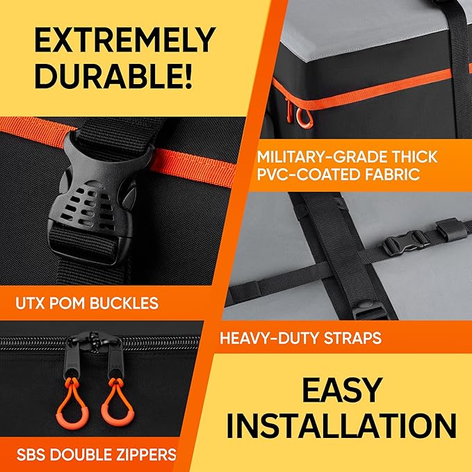- 100% WATERPROOF AND WEATHERPROOF. Built for all conditions, our waterproof and weatherproof car rooftop cargo carrier bag is made from military-grade fabric with a PVC coating. With a triple waterproof design—including an SBS zipper and hook-and-loop covers—it protects against rain, snow, and UV rays. Your roofbag is ready for any adventure.
