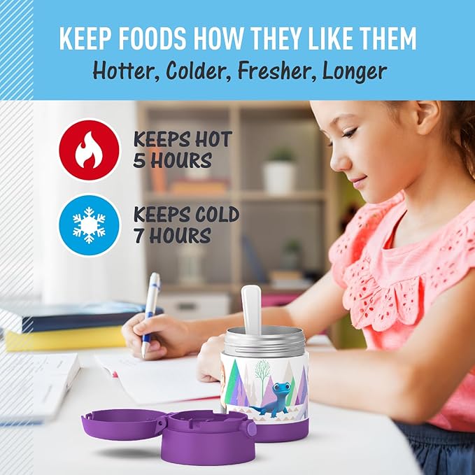 - Stays hot or cold: THERMOS vacuum insulation technology keeps contents hot up to 5 hours and cold up to 7 hours. Our insulated lunch containers are perfect to toss into your kids’ lunch box to send them with their favorite soup or cold snack.