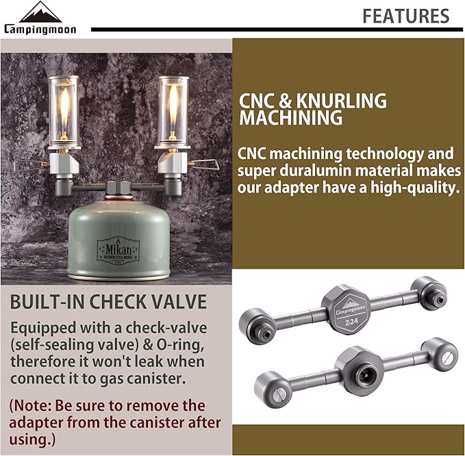 • BUILT-IN CHECK VALVE:Equipped with check-valve (self-sealing valve), therefore it won't leak when connect it to gas canister.(Note: Please remove the adapter from the canister after using.)