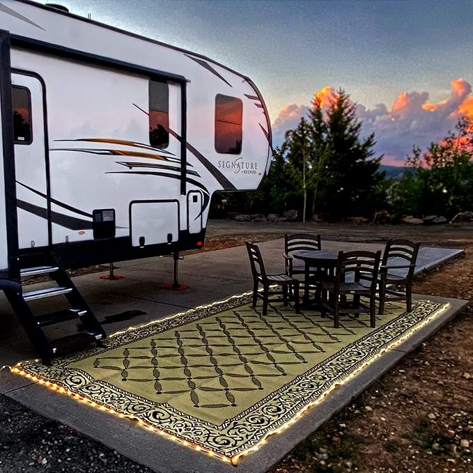 - MULTIFUNCTIONAL MAT: Use indoor or outdoor, Reversible mats are designed to be versatile whether it’s used on your patio, by the pool, picnics, or your laundry room. With its lightweight and foldable features, these mats are easy to move around furniture and transport. Plug into an outlet and light your patio with the border LED lighting.Construction type:Machine Made
