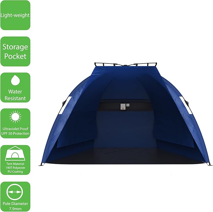 - PRODUCT DETAILS – Dimensions: 55" (H) x 87" (W) x 52" (D). Fiberglass poles- 7.9mm diameter. Tent Material 190T Polyester. UV Rating: UPF 50+. Water Repellent. Includes tent, carry bag, stakes and sand pockets. Color: Blue