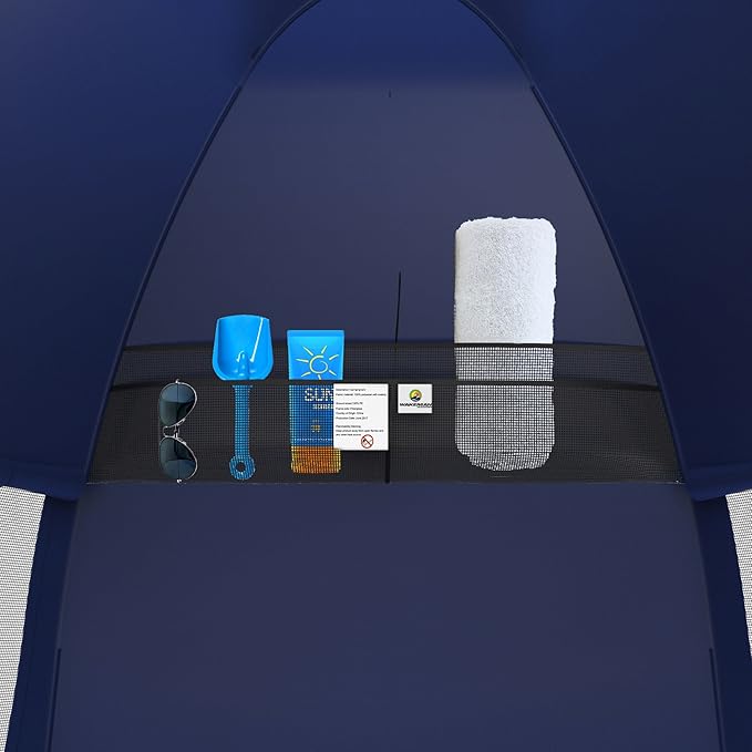 - CONVENIENT FEATURES – The fiberglass poles and sand pockets stabilize the tent against wind and the mesh windows provide ventilation and bug protection. It also includes a storage pocket for beach day accessories like suntan lotion, sunglasses and towels.