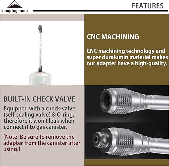 • BUILT-IN CHECK VALVE:Equipped with check-valve (self-sealing valve), therefore it won't leak when connect it to gas canister.(Note: Please remove the adapter from the canister after using.)