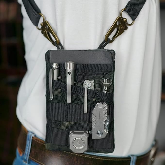 - 【High Capacity】Pocket tool organizer has four accessory pockets and a zipper pocket on the back, which can hold mini flashlights, folding knives, tactical pens, larger multi-tool and other EDC gear. The large pocket at the top usually holds a 3.5''*5.5'' notebook or your cell phone(Screen Size ≤6.5’’). MOLLE plug-in design can hold tools with pocket clips, which greatly saves space.