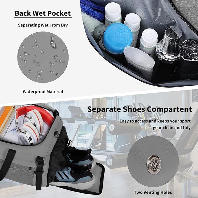 - Dry & Wet Compartment Separation: This gym tote delivers spacious storage with 1 large main zippered compartment for dry & clean clothes or everything for gym & traveling you necessary, and 1 upgraded waterproof PVC lined pocket (20" x 13") with zipper for wet items alongside the main compartment, in addition.