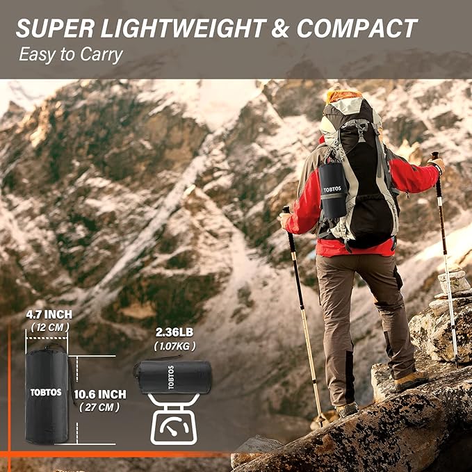 - Extra Thick Camping Pad: TOBTOS sleeping pad is wider and thicker than others on the market. It can be up to 6 in thick once full of air, which is our biggest advantage. It can stay away from the hard ground and sleep comfortably in any sleeping position