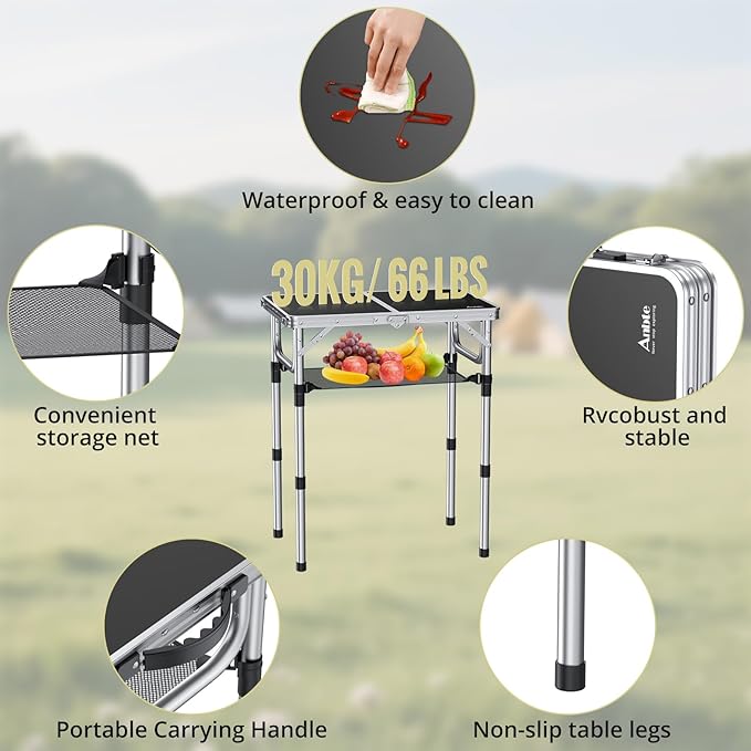 - Stability & Waterproof: The entire frame of the camping table is made of thicker aluminum alloy, which is very solid and durable. MDF (Medium Density Fiberboard) tabletop is smooth and easy to clean. This allows any spills or messes to be cleaned easily
