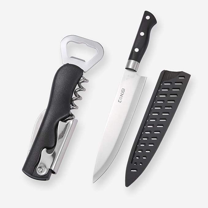 - Camping Cooking Accessories : Camping Cooking Utensils Set include Corkscrew, bread clip, scissors, chef's knife, frying spatula, barbecue clip, soup spoon, non-slip gloves, cutting board, paring knife, cleaning towel, 2* pepper shaker, 6 kebabs and storage bag,wild application beyond your imagine
