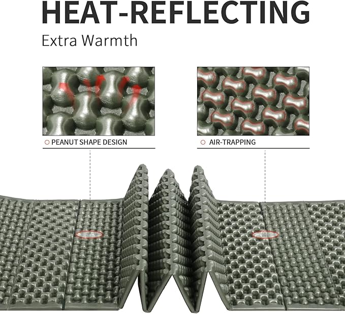 - 【Upgraded Version】The foam sleeping pad is covered with aluminum film, this extremely lightweight coating turns that surface into a very efficient heat reflector, amplifying warmth without the excess weight or bulk added, conventional insulating material is more moistureproof, more durability and easy to clean than the traditional model.