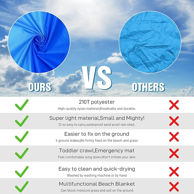 - ️Beach Blanket Oversized:Good wear resistance,Dry-Quick,Can also be used as a rain shed,sunshade,tent,toddler crawl,Emergency mat,Feel comfortable lying down,Won't irritate your skin,Better professional fabric sewing