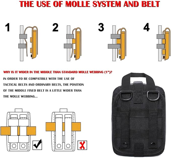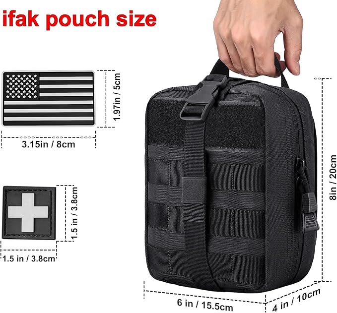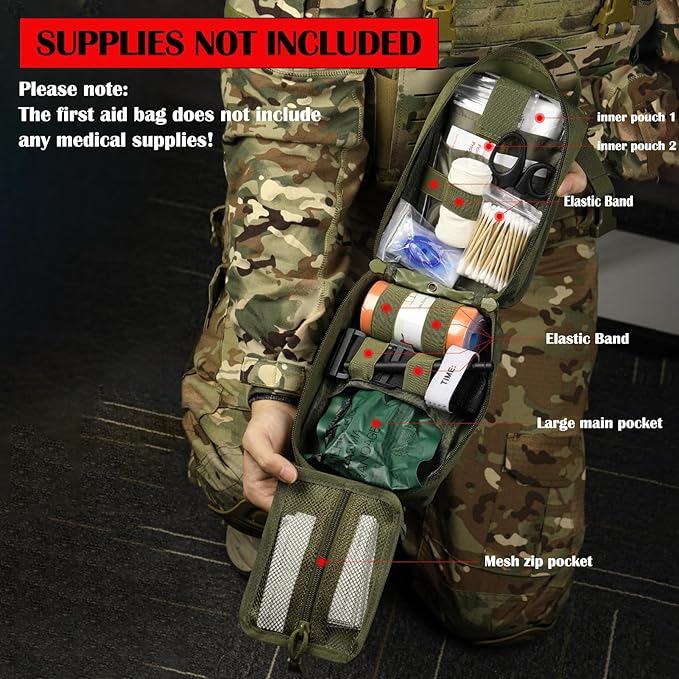 - Tactical first aid bag is military grade Molle compatible tactical medical pouch, compact IFAK Universal Pouch with elastic straps inside.Perfect for carrying medical supplies(Medical supplies do not included!!!.).