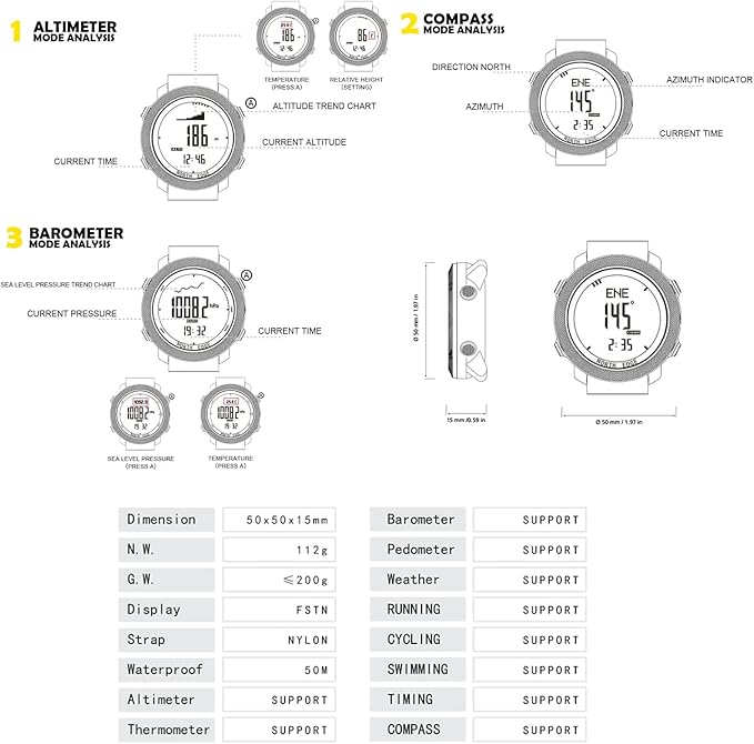 - ++Battery life :18 months +Function Brief:Compass, Altimeter,Barometer , Thermometer,Weather Forecast, World Time,Dual Time,Pedometer, calorie, distance record,2 sets alarm,Countdown timer ,Stopwatch, EL Backlight.