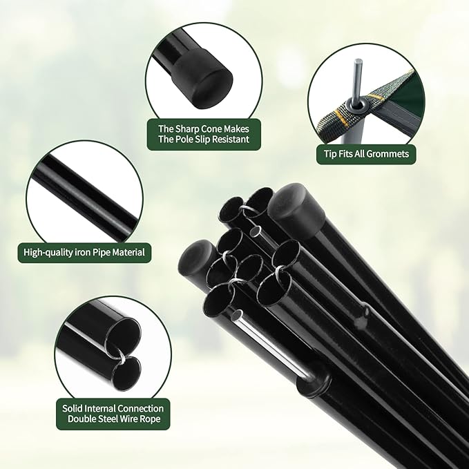 - Convenient & Easy to Install: Our tent tarp comes with all necessary tools --2 poles, and 12 guy lines, very convenient and sets up in minutes.With many grommets for multiple anchoring points, this tarp can be used with the included poles, trekking poles or sticks to put up as a tent, or tied between two trees for a hammock. Use the ropes included to tie the tarp and fix the tarp with pegs.