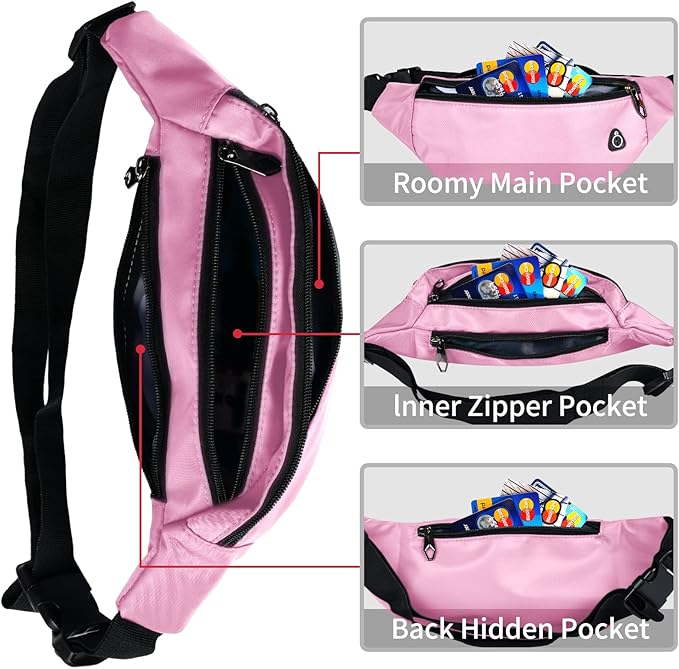• Fanny Pack with 3(Three) Zippered Compartments :include main pocket,front pocket and back pocket.(1)Main pocket can easily hold your most needed items such as purse,keys and other items. (2) Front pocket can easily carry your phone,because it is large and seperate .(3):On the back side is great for you to keep your valuables away from the thieves.
