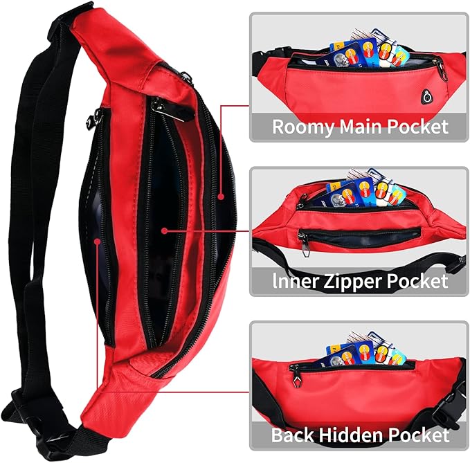 - Fanny Pack with 3(Three) Zippered Compartments :include main pocket,front pocket and back pocket.(1)Main pocket can easily hold your most needed items such as purse,keys and other items. (2) Front pocket can easily carry your phone,because it is large and seperate .(3):On the back side is great for you to keep your valuables away from the thieves.