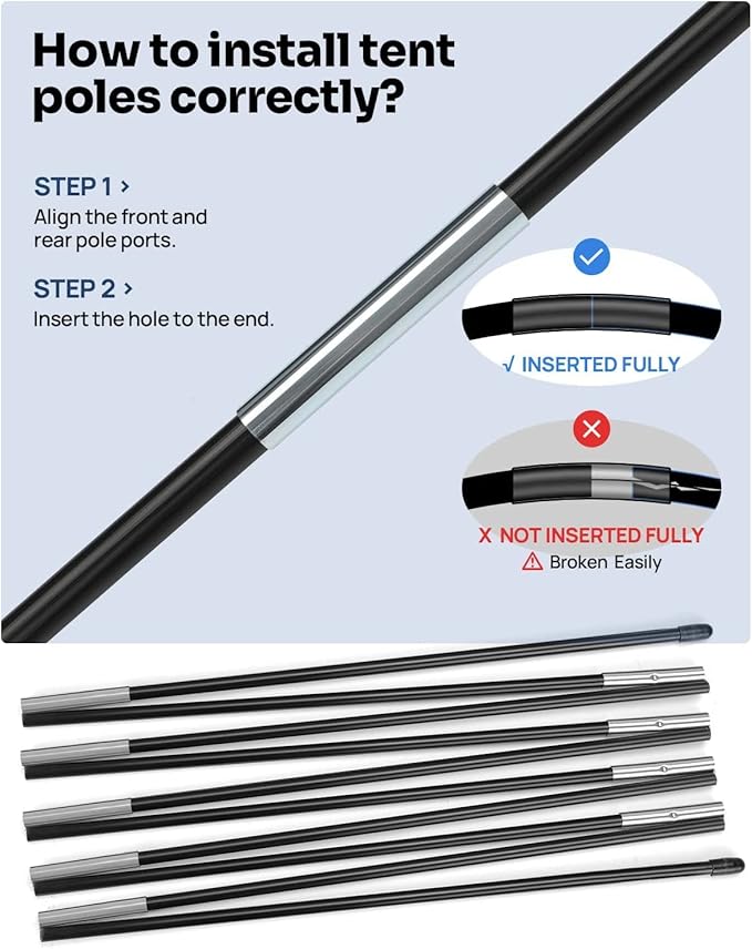 - 【Easy Installation】: The installation instruction is included for quick and fast assembly. Pay attention when you install Tent Poles, check the front and rear poles are tightly connected and seamless, otherwise, the poles will be broken easily. (If during installation tent pole breaks due to improper operation, we will provide a one-time free opportunity to replace the pole)