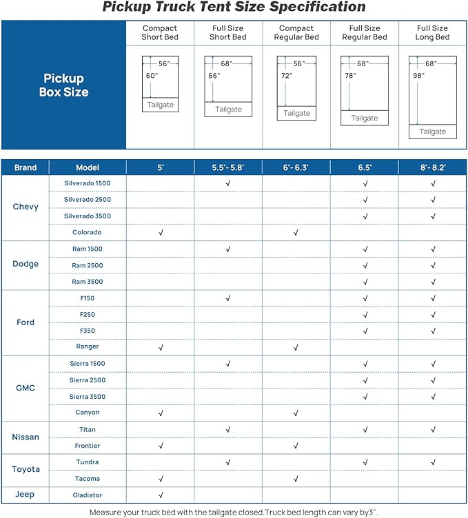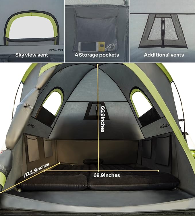 - 【Compatibility】: The truck bed tent will fit a pickup truck with a 6.5 ft truck bed. Compatible with F150, Ram, Silverado, Tundra, Sierra, Titan, etc. Perfect with Joytutus truck air mattress for comfortable car camping, fishing, hiking, etc