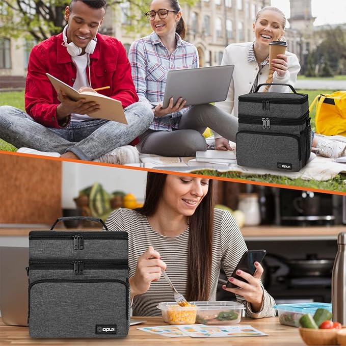 opux Insulated Lunch Bag for Men Women, Large Dual Compartment Cooler Bag, Soft Two Deck Lunch Box for Work School Picnic, Leakproof Lunch Tote with Strap for Kid Adult (Charcoal Gray, Double Deck)
