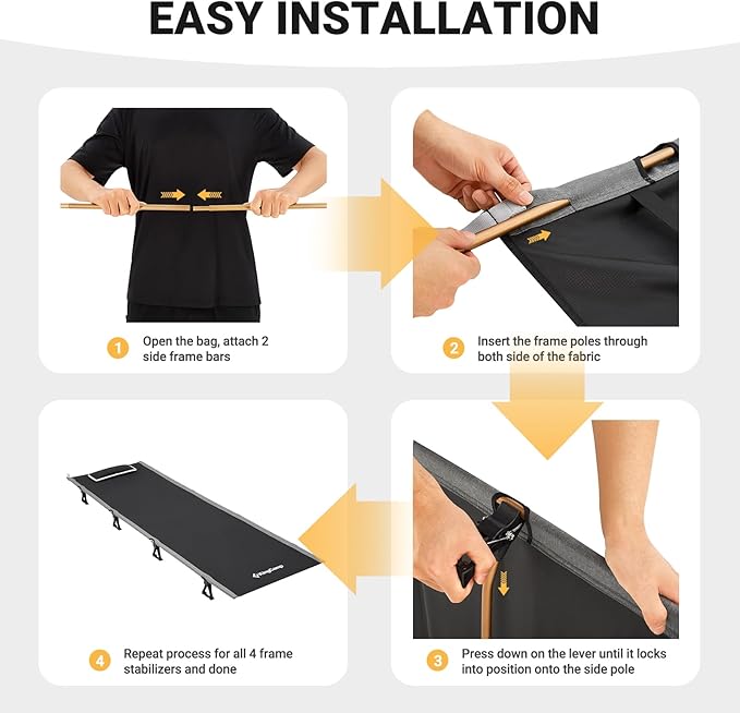 - ✔EASY to SET UP and LIGHTWEIGHT PORTABLE DESIGN: No assembly required. The sleeping cot for adults can be easily installed or folded up into an included storage bag within 10 seconds. Pack size 14"×5.1"×5.1". Weight 4.4 pounds.