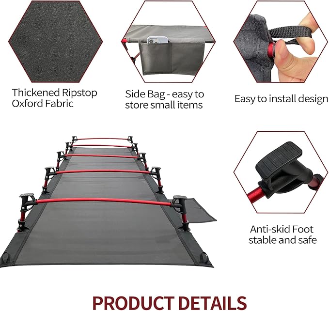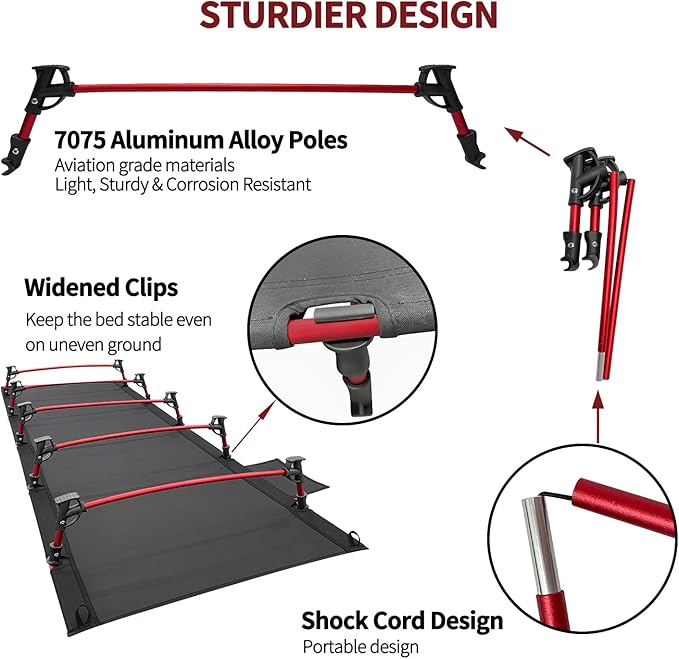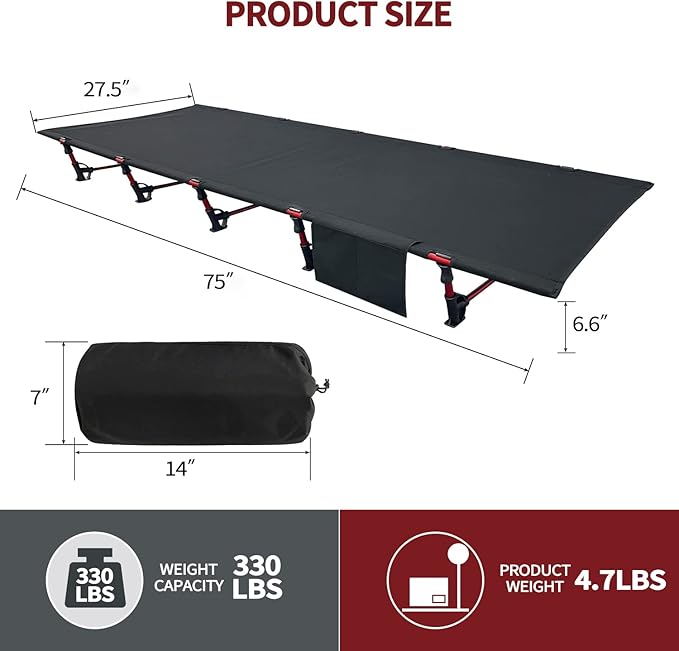 • Cot bed size 75" × 27.5" × 6.6", folds down to 7" × 14", can be easily fit into your backpack. Cot weighs 4.7lbs and can support up to 330 pounds. With 10 points of contact with the ground to evenly distribute weight, the cot is very stable.