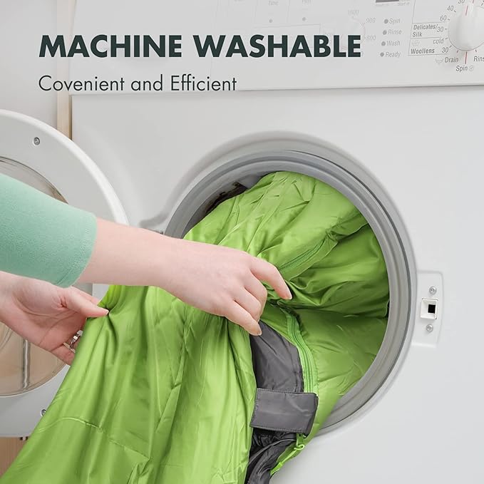 - User-Friendly & Easy to Clean: This roomy mummy sleeping bag with a two-way zipper, which can be unzipped inside or outside, is easy to pull back and forth, and the wrap-around zipper can also adjust the temperature according to your needs. The shell of the sleeping bag and compression sack is easy to clean, in case of heavy soiling, the sleeping bag is also designed to be machine washable