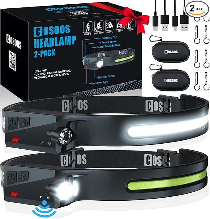 COSOOS 2 Rechargeable Headlamp Flashlight & Carry Case, Bright LED Head Lamp Outdoor, Wide Beam & Spot Light, Motion Sensor, 2.4 oz Lightweight Headband Headlights for Hardhat Camping Accessories