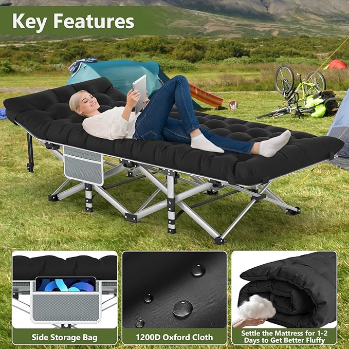 Slendor Folding Camping Cot Black, Sleeping Cot for Adults with Carry Bag, Mattress, 1200D Layer Oxford Portable Camp Bed Cot Bed for Guest Travel Office Beach