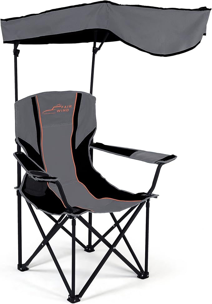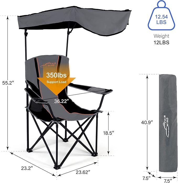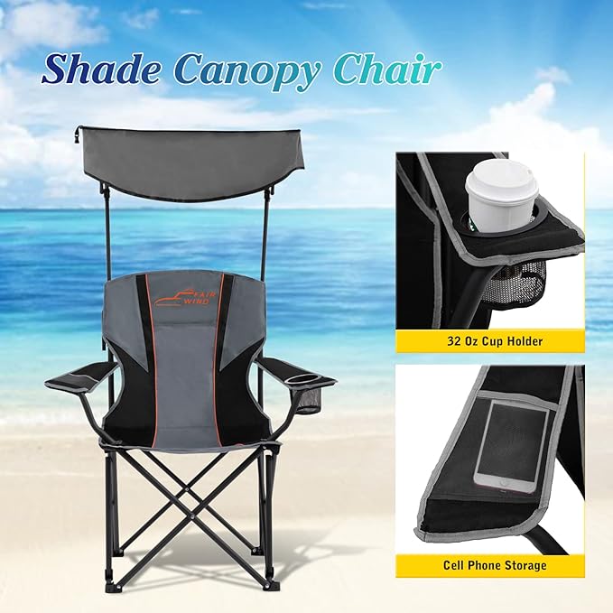 FAIR WIND Oversized Camping Lounge Chair with Adjustable Shade Canopy, Heavy Duty Quad Fold Chair Arm Chair - Support 350 LBS (Black Grey)