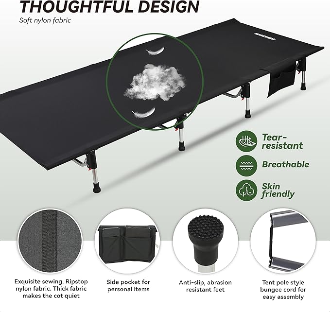 - Superior Comfort: Length and width are optimal for most adults. Your shoulders, back and legs can be well supported. Lever lock structure stretches the fabric to keep it taut without sagging. Thick fabric makes cot quiet even if you turn around while sleeping. 8-inch height keeps you away from the cold on the ground while giving you enough headroom in the tent.