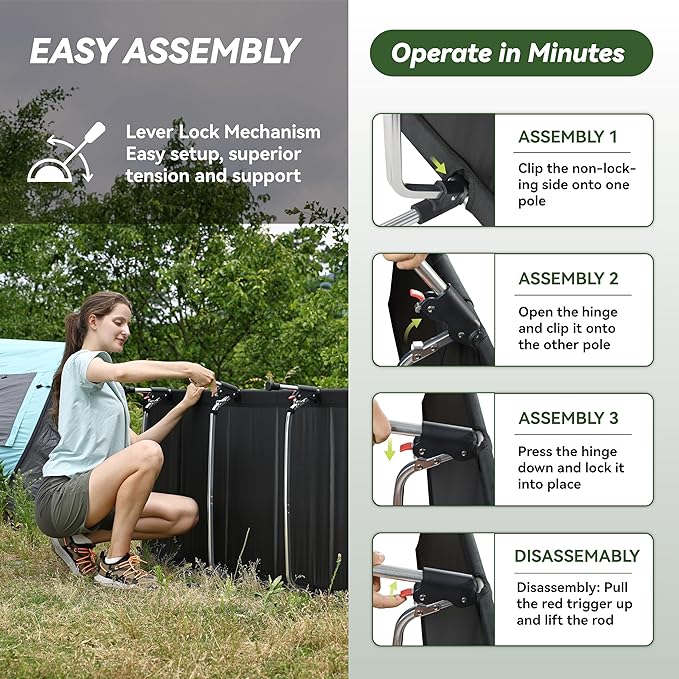 - Easy Setup and Take Down: The structure of connecting rods with internal bungee cord makes it easy to fold. The innovative lever lock mechanism saves time and effort in assembly. You can prop up the cot just by gently pressing the rod down, the whole assembly takes only a few minutes.