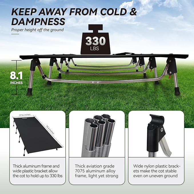 - Steady and Heavy Duty: Thick high strength aircraft-grade aluminum frame and tear resistant nylon fabric enable the cot to support up to 330lbs. Wide plastic brackets on the rod keep the cot stable without wobbling even on unlevel ground. 8 anti-skid feet provide firm grip and evenly distribute weight.