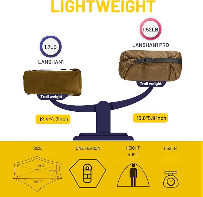 - ULTRALIGHT BUT DURABLE: Weighing at only 1.74 pounds for 1 person LANSHAN 1 PRO tent and 2.21 pounds for 2-person LANSHAN 2 PRO tent. LANSHAN PRO tent is 0.5-0.6 pounds less than the Lanshan while providing you with the same protection. Compact in size allows your backpack to be smaller and lighter in overall size and weight. Small packed with 13.8in*5.9in, so you can carry it easily on backpacking or camping trips