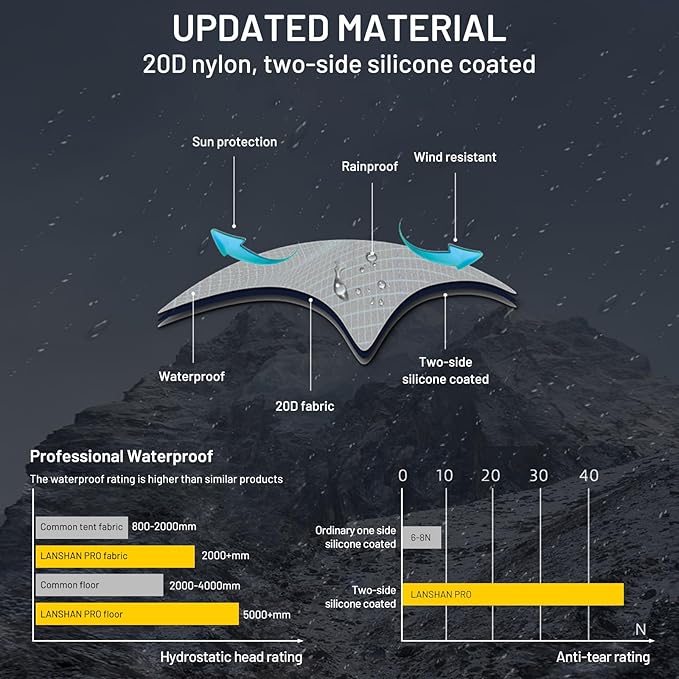 • SUPER WATERPROOF TENT: It's constructed from 20D nylon from the rainfly to the floor making it more durable and waterproof than the standard version. Seam-taped rainfly (20D nylon, two-side silicone coated/PU 2000mm) and bathtub floor (20D nylon, silicone/PU 5000mm). The tent is as strong although it is lighter. Solid as a rock in the windy storm and it can also hold up to hail and thunderstorms. Anti-UV and tear resistant