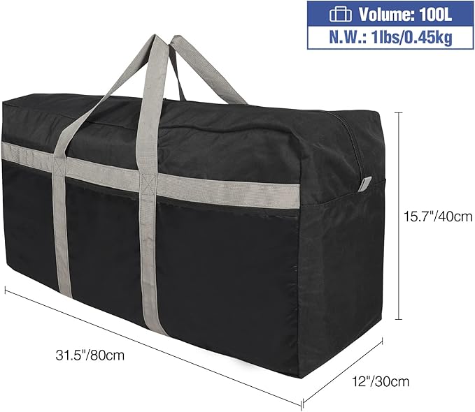 - Large Capacity & Lightweight: Up to 100L with dimensions of 80x30x40cm/31.5x12x15.7‘’(L x W x H); It can be folded into a compact carry pouch of 25x25 cm/ 9.8x9.8‘’( L x W ). Weighs only 1lbs/0.45kg.