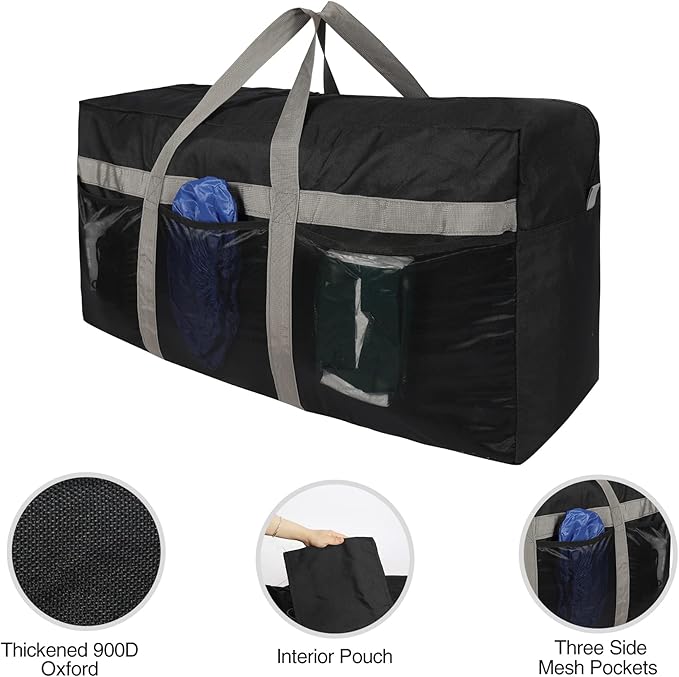 - Practical Pockets:The REDCAMP large duffel bag is equipped with 3 outside pockets with 3 open mesh pockets on the side. It also has an interior pocket that the duffel bag folds into when not in use.