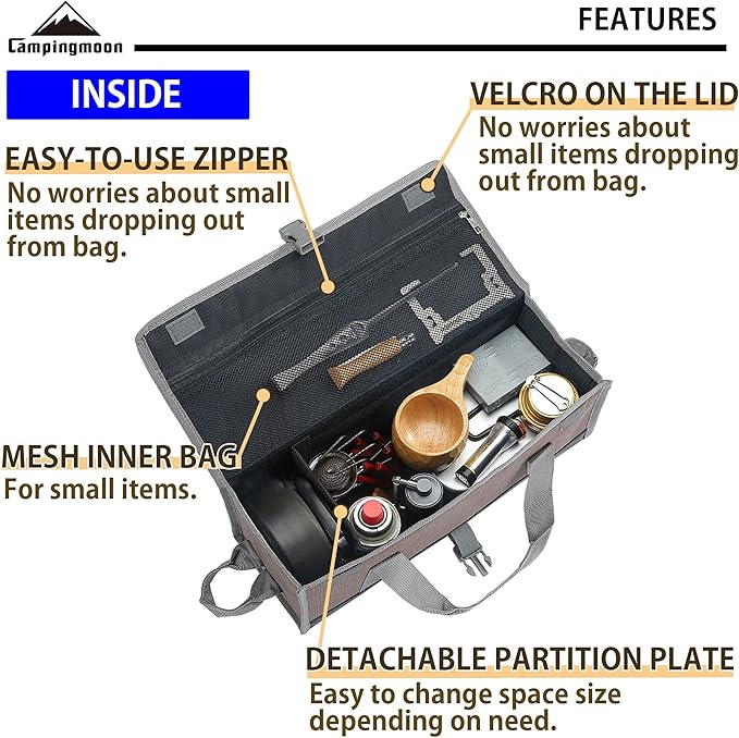 • This is a compact size container type camping gear storage case. The inside partition plate is removable and can be adjusted in your need.
