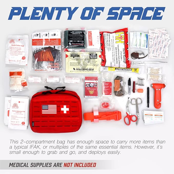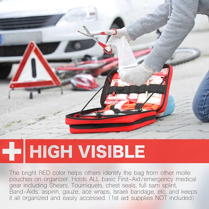 - Premium Nylon & Zipper: IFAK pouch is made of 1000D nylon for sturdily, tear-resistance and water-resistance. Molle EMT pouches has a sturdy and smooth double zip that opens quickly and lays flat for easy access to tools or tactical gear. Thanks to the good closure of the zip, can be kept dry and protected from moisture and sand. Tactical med Pouch will be perfect for your field day or everyday activities. Dimensions: 9.5 " L x 7.5 " H x 3.2 " D