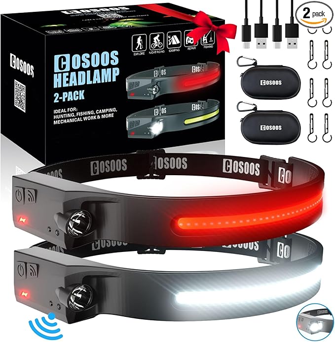 COSOOS Original 2 Rechargeable Headlamp Flashlight w/Red Light & Carry Case,1000 Lumen Bright LED Head Lamp Wide Beam, Motion Sensor, 2.4 oz Lightweight Headlight for Hiking & Camping Gear