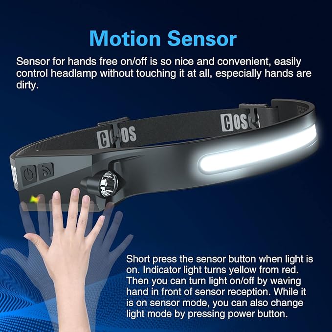 - Motion Detection Technology, Hand-Free Light: Save tons of extra battery. COSOOS wide angle headlamp has built-in 1200 mAh lithium battery and please charge it by included usb c charging cable before use. Choose 1 of brightness settings, short press sensor button and set it as motion detection (Indicator light turns yellow from red.) Then you can turn light on/off by waving hand in front of sensor reception