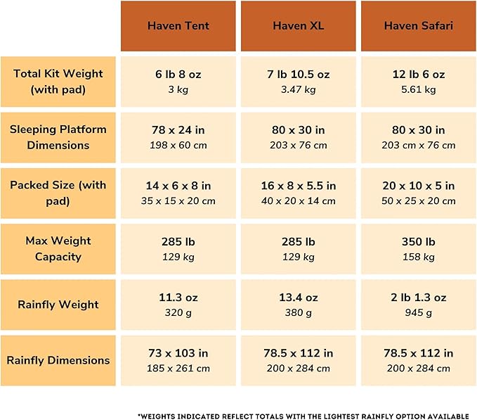- HAVEN XL: Haven Tent XL size for more room and more comfort. 80x30 dimensions. Ripstop Nylon waterproof hammock tent. Total kit weight of 7.7 lbs. Our hammock tent packs small and is easy to put away.