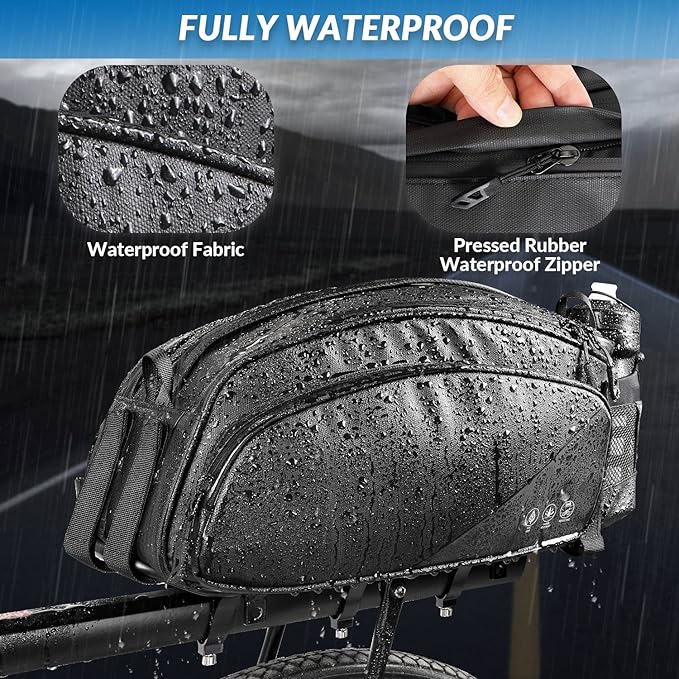 - 【Rainproof & Built to Last】The bike trunk pack is made of 900D Oxford fabric coated with superior PU film, which is rainproof and easy to clean. The laminated waterproof zipper also help to prevent rain from penetrating in