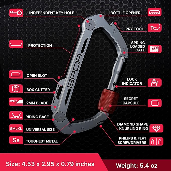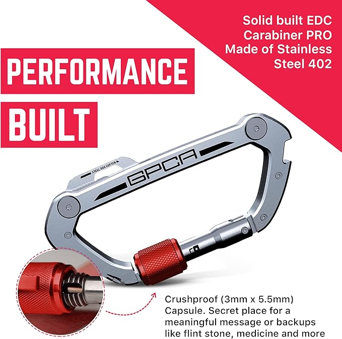 - PREMIUM GRADE MATERIALS: GPCA Carabiner Keychain Clip is known for its strength and durability. It serves as a reliable travel accessory, perfect for outdoor adventures. With a high load-bearing capacity, our carabiner keychain clip is not just for keys. It can handle heavier items like tools, flashlights, or even small bags, making it a versatile tool for any situation.