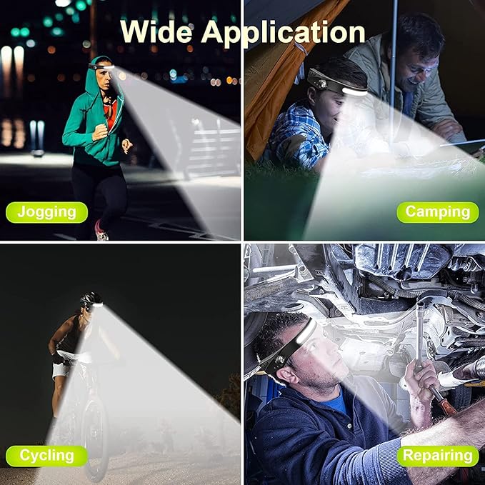 - 🎉🎉🎉【SUPER BRIGHT HEADLAMP AND 230° WIDE ANGLE LIGHTING】: the rechargeable headlamp offers a 230° ultra wide viewing angle to easily illuminate dark environments. The light strip head torch with front COB LED light and the side LED head torch provide a bright viewing area when you are fishing, running. 600 lumens and 230° sensor viewing angle can easily illuminate dark environment.