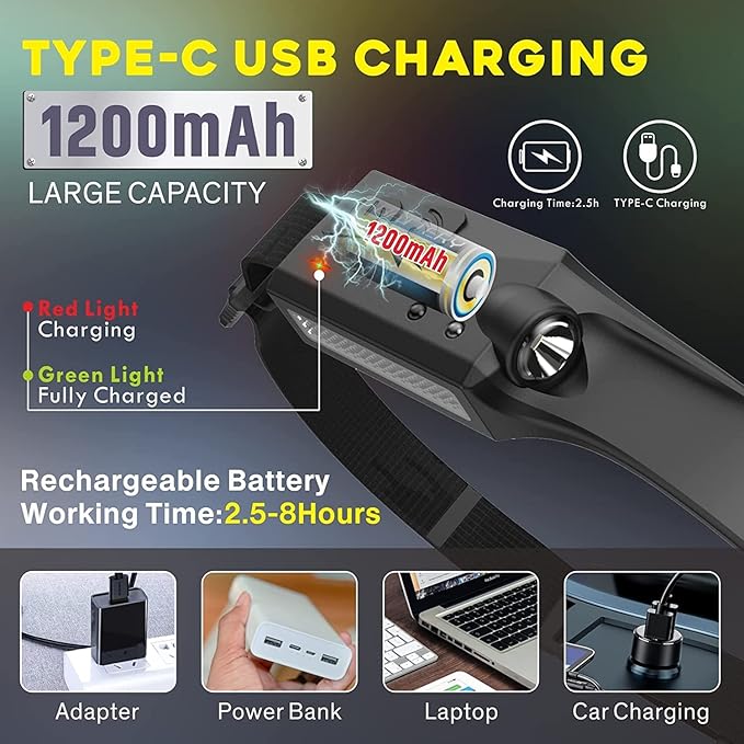 - 🎁🎁🎁【RECHARGEABLE JOGGING HEADLAMP】: IPX4 waterproof LED running light rechargeable, built-in battery in 1200 mAh lasts a long time, the running headlamp is charged via the included USB charging cable, which can be connected to any current USB socket. With only 2 hours charging time, the rechargeable jogging lamp provides up to 4 - 8 hours of constant light.