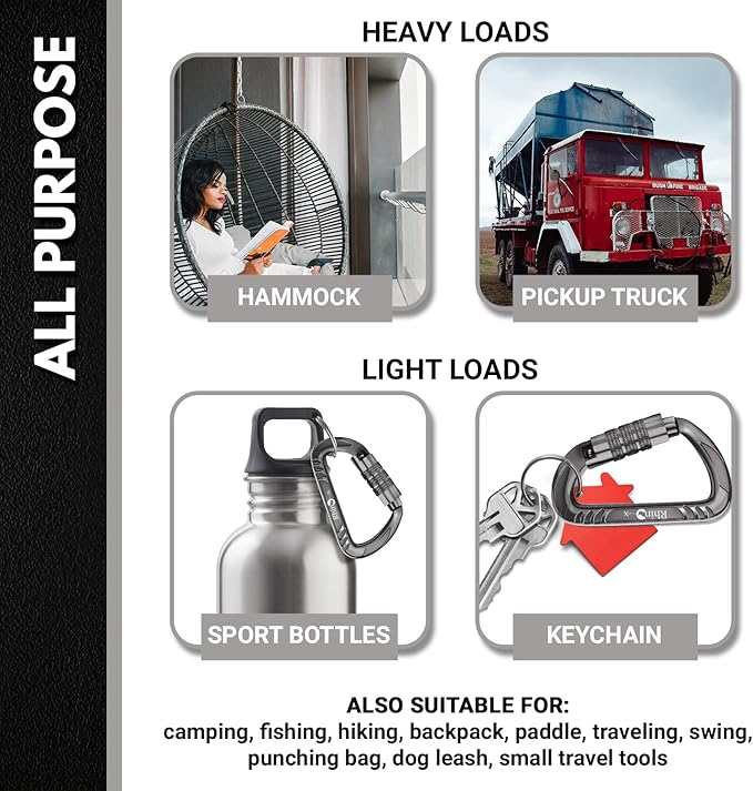 - 【Multi Purpose】 Rhino locking Carabineers are suitable for: hammock, camping, fishing, hiking, backpack, paddle, traveling, swing, punching bag, dog leash, attach sports bottles, yeti sling, keychain, travel tools, fix heavy object on a pickup truck, backpack clips for kids, keychain for women, bag hook, snap hooks, key clip for men, accessory & keychain carabiners, gear ties, toy grappling hook, cable machine accessories, key holder, d ring, boxing bag. Not For Climbing.